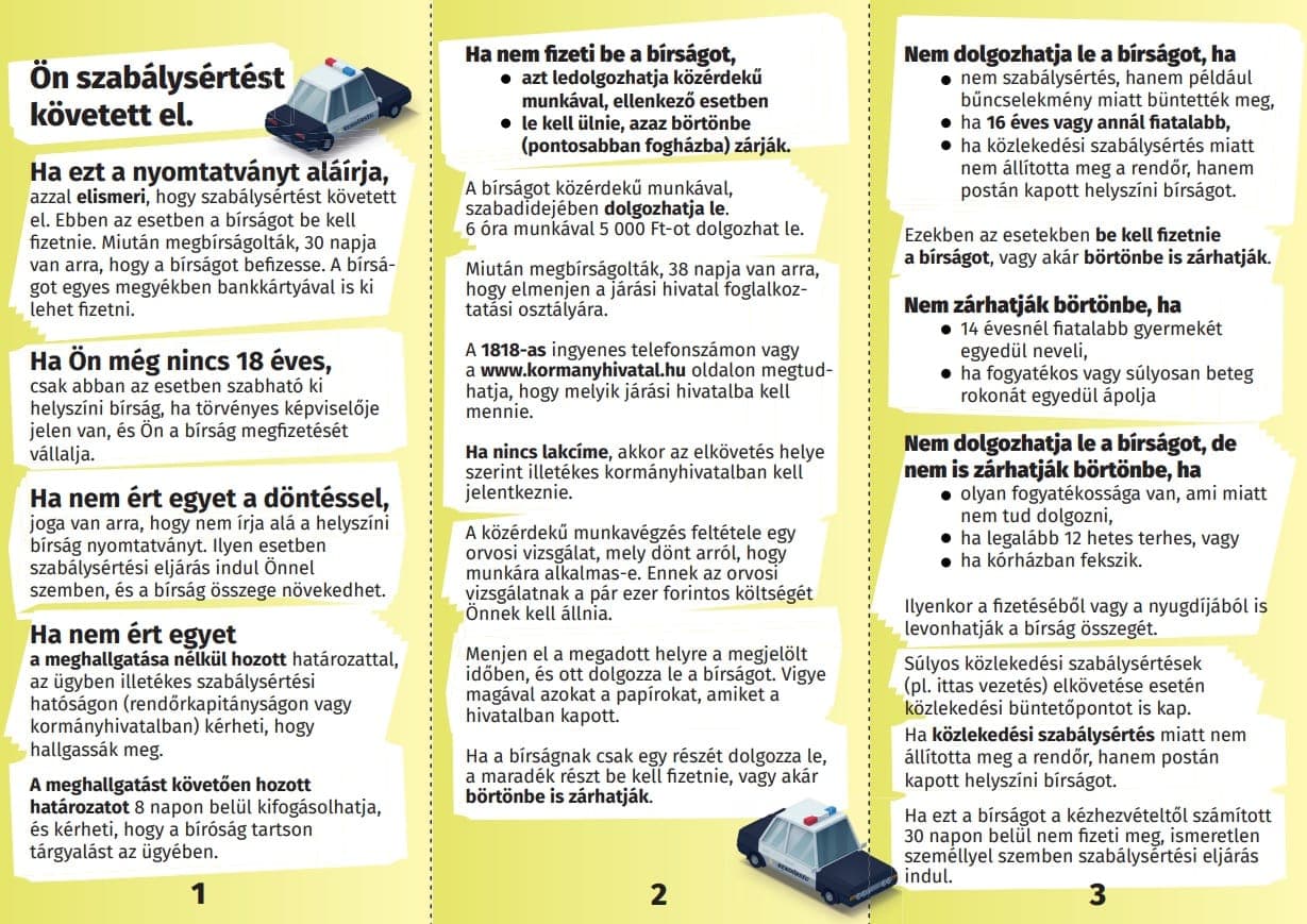 A szabálysértők gyakran nem tudnak élni a jogaikkal, pedig a pénzbírság megfizetésén túl más lehetőségeik is vannak, például kezdeményezhetnék a bírság közérdekű munkára átváltását. Ha valakit szabálysértésen érnek, az első nyomtatvány, amellyel találkozik, a helyszíni bírsághoz kapcsolódik. Ez a nyomtatvány egy átlagembernek is nehezen érthető.