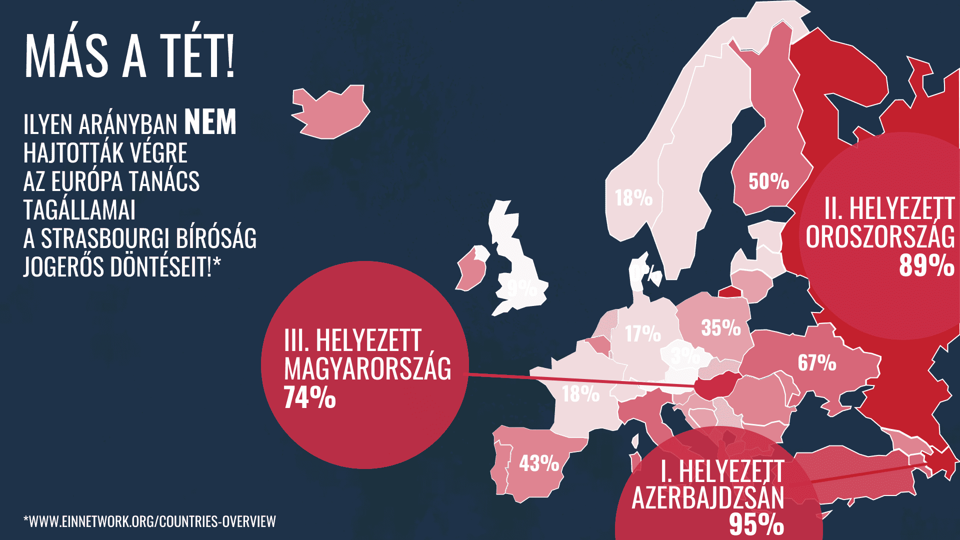 A strasbourgi bíróság „elvi jelentőségű ítéleteinek” 74%-át nem hajtotta még végre Magyarország. A European Implementation Network (EIN) adatai szerint az Európa Tanács 47 tagállama közül csak Azerbajdzsán és Oroszország áll rosszabbul, mint mi. Ez annál is aggasztóbb, mert a strasbourgi ítéleteket minden esetben végre kell hajtani, és az Európa Tanács Miniszteri Bizottsága addig nem tekinthet lezártnak egy ügyet, amíg esélye marad hasonló jogsértéseknek.